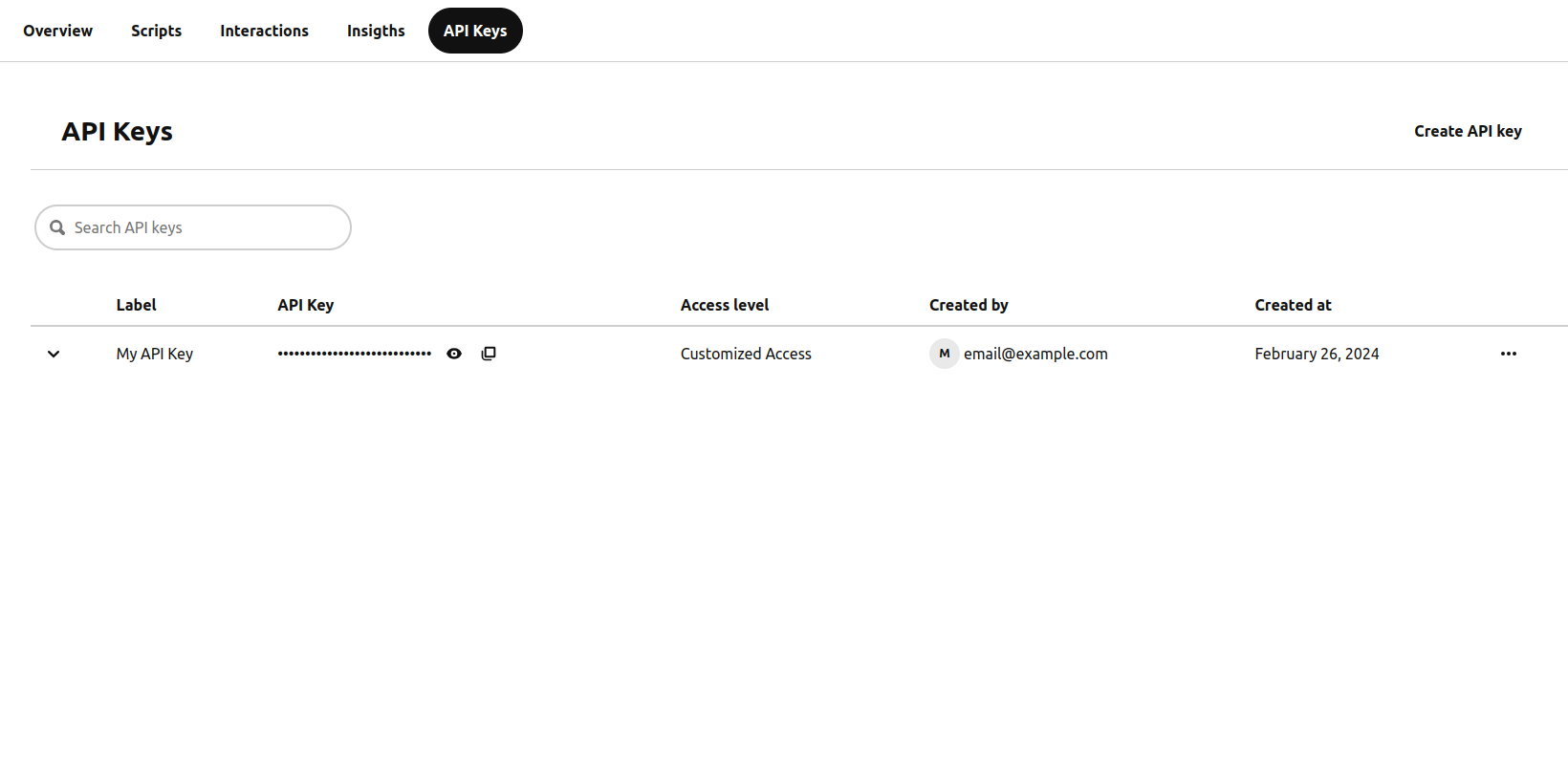 Retention Script uses API keys to allow access to Retention Script's REST API's.